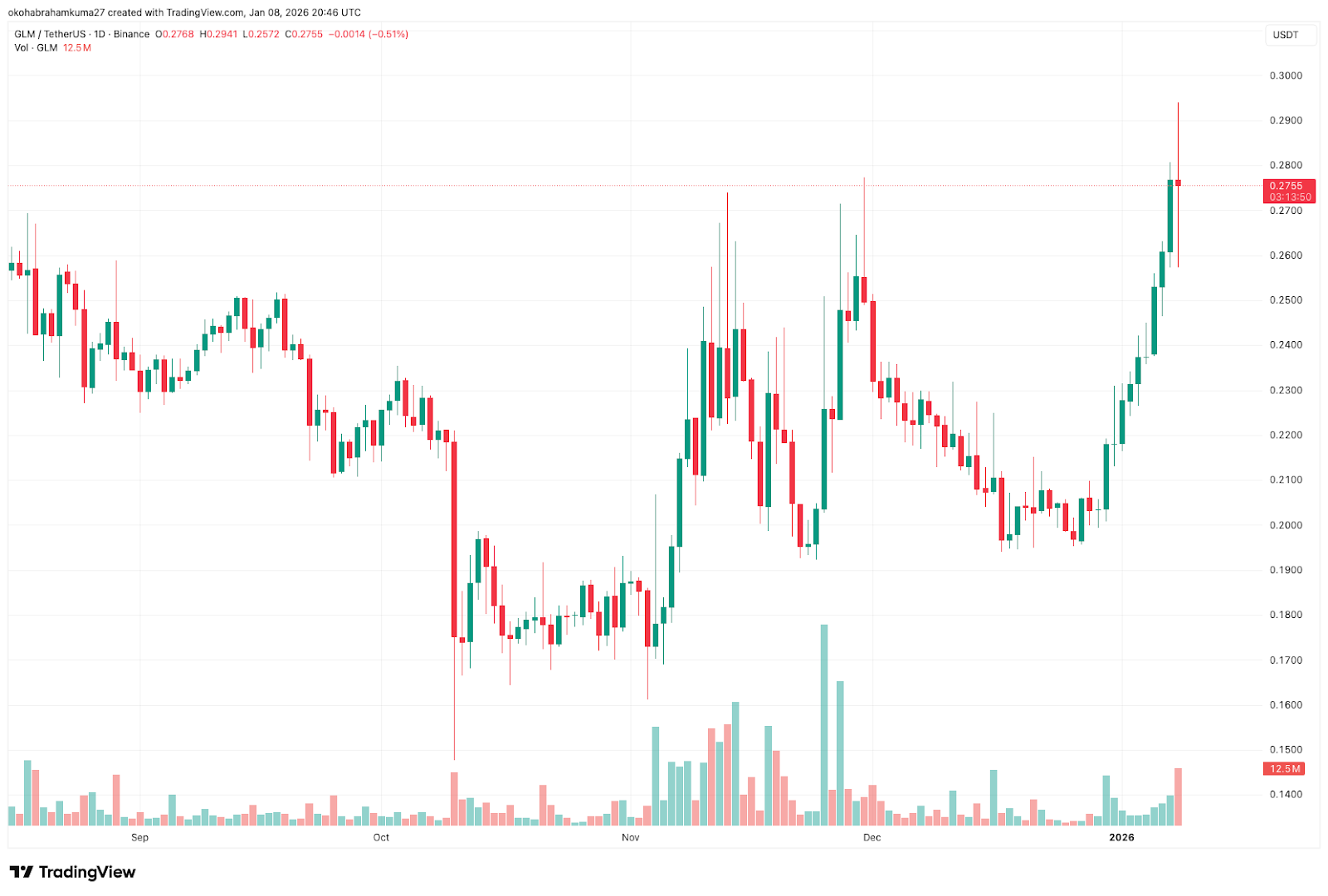 Golem is one of the top AI crypto coins performing this week. The token has seen a massive surge in activity, with trading volume hitting nearly $36 million in the last 24 hours, a 236% increase. This made the price increase by more than 18% in the last week as of January 8th, creating a bullish structure on the charts.