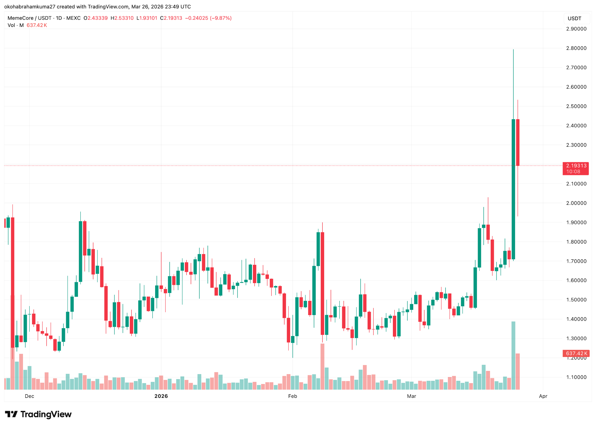 MemeCore’s trading volume as of March 26th increased by over 114% in a single day, topping $26 million. Within the same period, its fear index sits at just 10, and its RSI reading suggests it’s overbought, meaning a price correction could be coming.