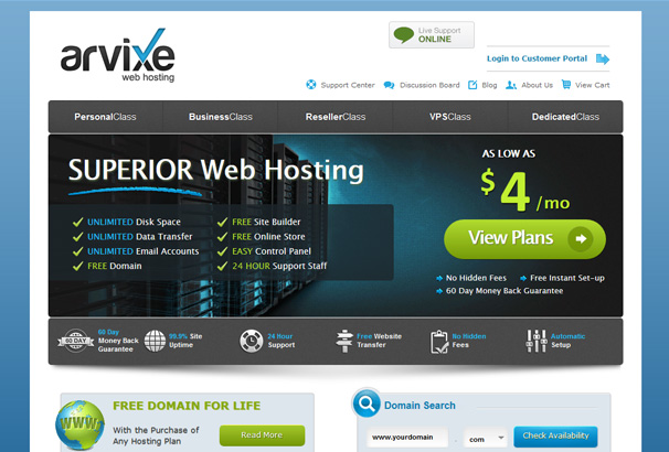 Arvixe’s hosting plans start at $4 per month and include a free domain name for life. They also offer a 60-day money back guarantee.