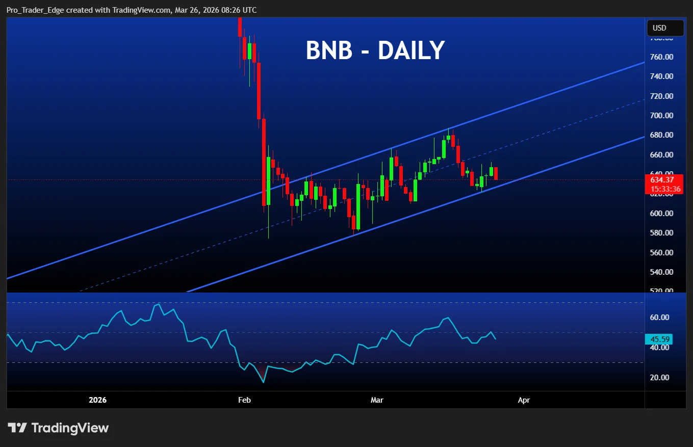As of March 26, Binance Coin trades near $648 with the critical $600 support level remaining intact.