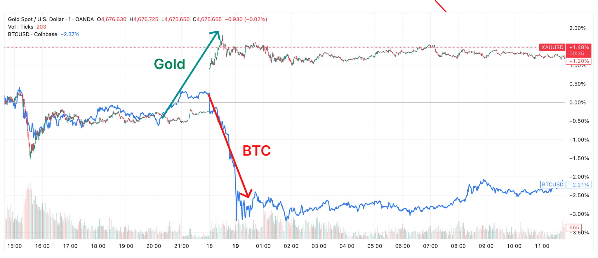 In fact, after Trump’s announcement of a 10% tariff against several European countries over the Greenland issue, Bitcoin and gold moved in opposite directions.