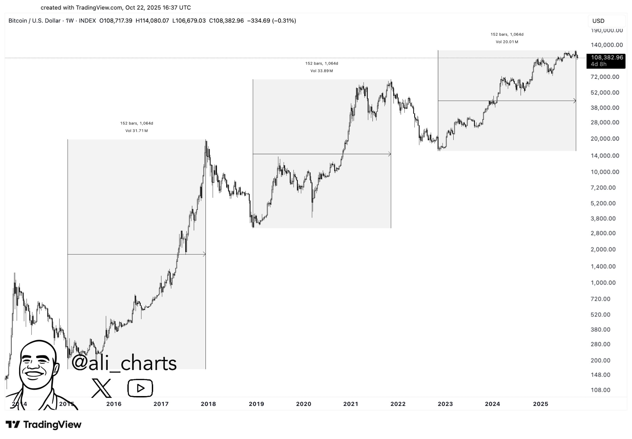 According to an analysis prepared by Ali Charts, it has been revealed that in the last two cycles, Bitcoin reached its bull market top exactly 1,064 days after the bear market bottom. The 1,064-day pattern was observed in both cycles, first from the 2018 bottom to the 2021 top, and then from the November 2022 bottom to the recent peak at $126,220.