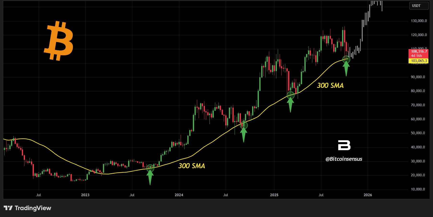 Subsequent corrections during 2024 and 2025 repeatedly find support at this moving average. Each retest coincides with price rebounds that maintain the bullish trend. The SMA consistently trends upward as Bitcoin’s price increases from below $20,000 to over $120,000. As of the latest data, Bitcoin trades near $103,000, directly interacting with the 300-day SMA support zone.