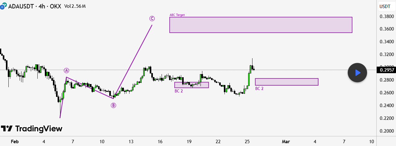 The third wave (C) initiated from that correction low but encountered resistance at $0.30 on February 15. Subsequently, ADA retreated to a support area between $0.26–$0.27, identified as the BC retracement level.
