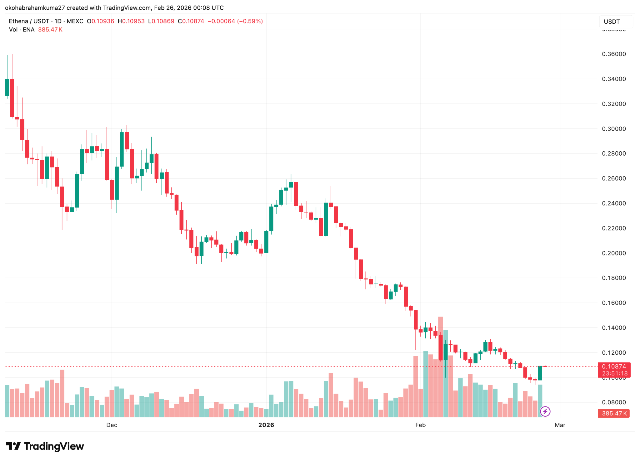 Ethena has a price outlook that’s not really promising despite appearing many times in daily digital asset updates. Data from the market shows that the token is trading at $0.1138 as of February 25th. But it has a very bearish sentiment and an extreme fear index of 11.