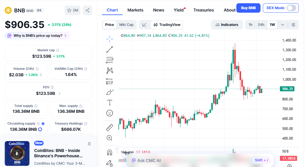 BNB currently trades around $904 on January 28 with a $123 billion market cap.