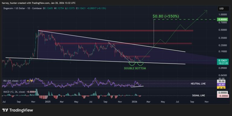 On the chart, Dogecoin appears to be testing the bottom of a falling wedge, with a double bottom forming around $0.115, suggesting a bullish DOGE chart pattern.