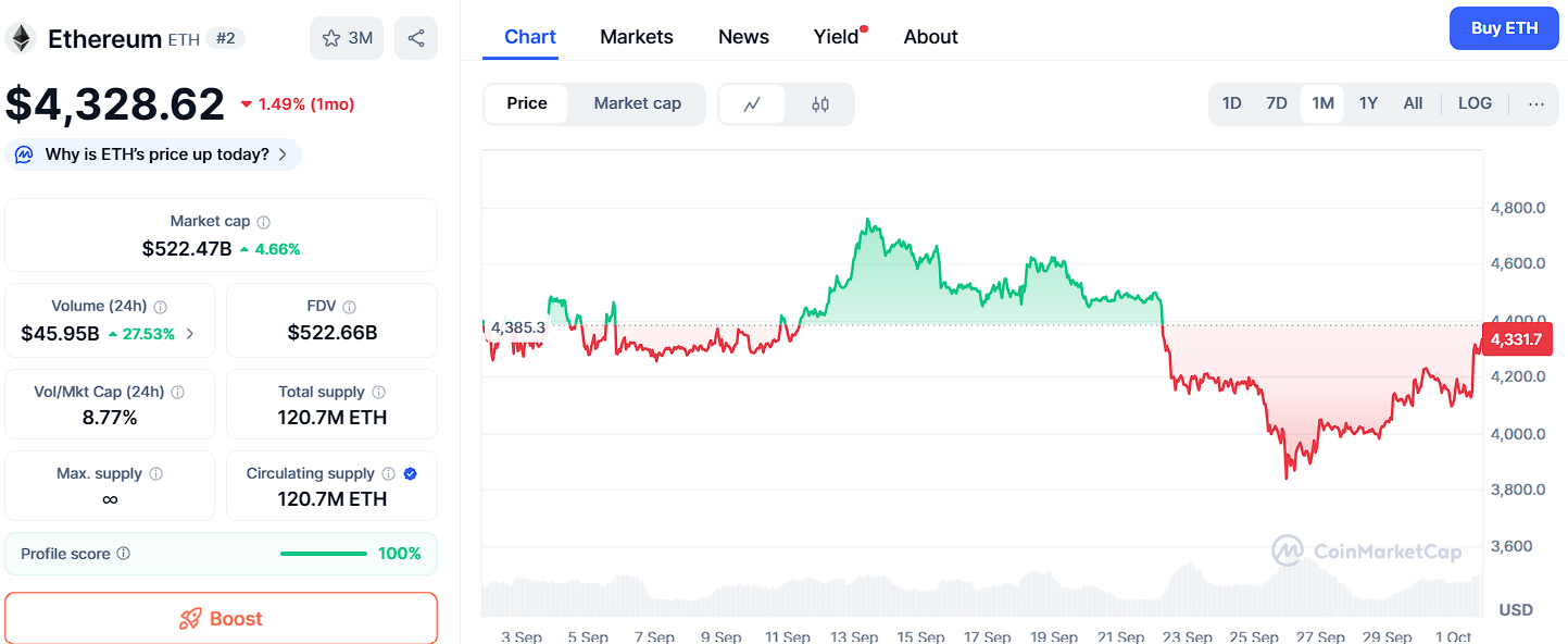 Ethereum is trading around $4,328, displaying electricity as decentralized programs, DeFi, and business enterprise adoption preserve to increase. Its role as the backbone of Web3 ensures long-term relevance, and its network improvements are keeping transaction speeds and prices competitive.