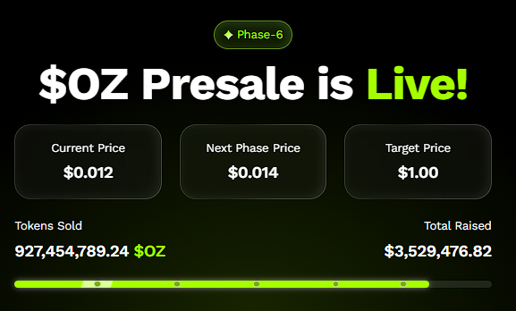 Yet as reliable as those potential tokens are, their growth is increasingly more regular in place of exponential. That’s why traders looking for the following massive entry are turning their eyes in the direction of Ozak AI (OZ), a presale project priced at simply $0.012 that has already raised over $3.5 million and sold greater than 925 million tokens.