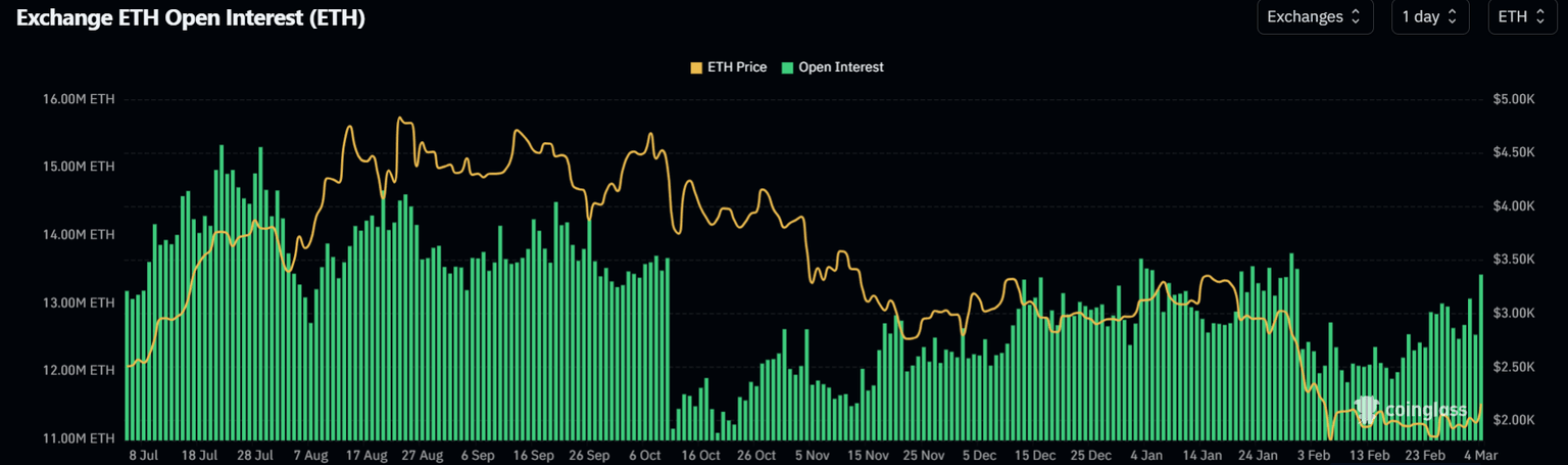 - Derivative open interest surged nearly 15% to 13.43M ETH, the strongest level since January 31