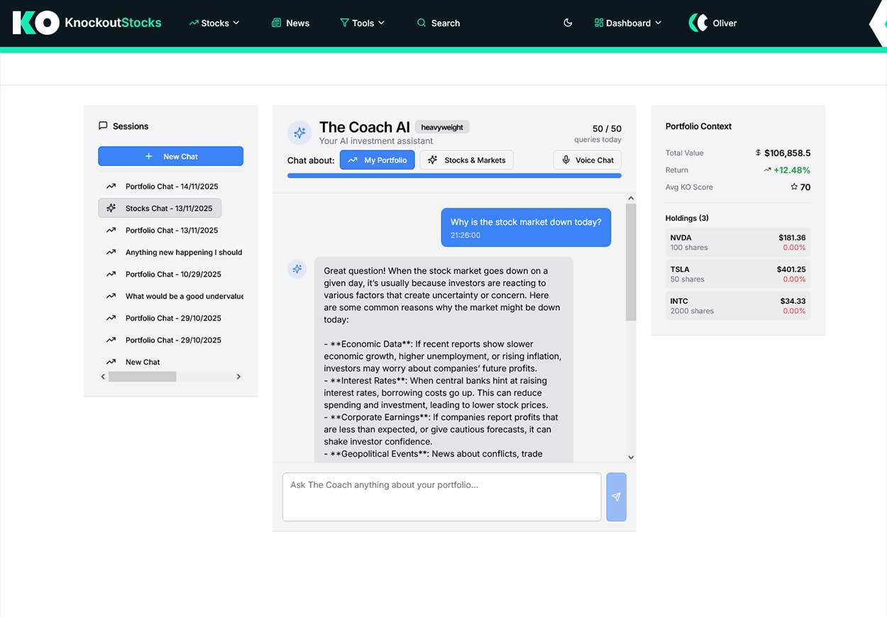 For KnockoutStocks, artificial intelligence isn’t an add-on — it’s fundamental to the platform’s design. The AI coach feature allows investors to pose questions about specific securities, portfolio composition, or broader market trends whenever needed. Premium subscription tiers unlock voice-activated AI and remove daily query limits.