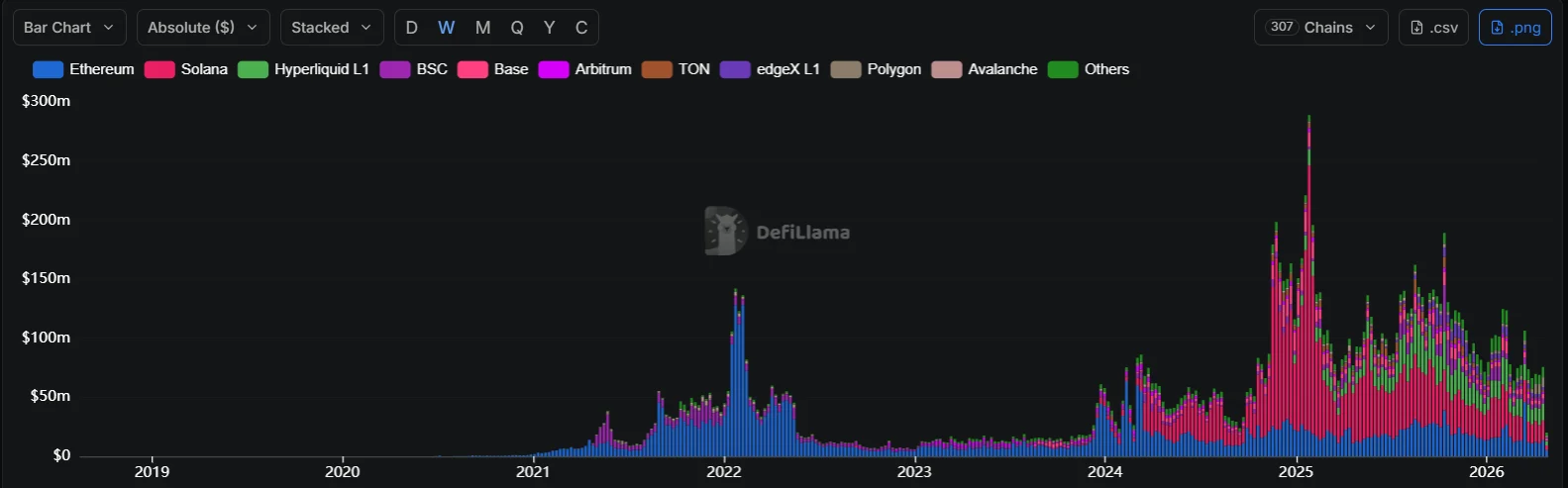 Hyperliquid L1 secured second position with $14.18 million, while Ethereum claimed third at $13.55 million. Lower-ranked networks included Polygon with $7.58 million, Base at $4.28 million, BNB Chain generating $4.15 million, Arbitrum at $1.62 million, and TON recording $1.37 million.