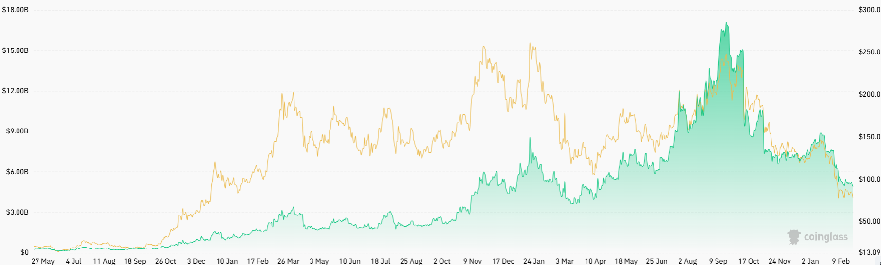 Futures open interest for Solana contracted by roughly 2% to approximately $5.09 billion, despite a notable surge in trading volume. This pattern often indicates forced position closures rather than fresh capital entering the market.