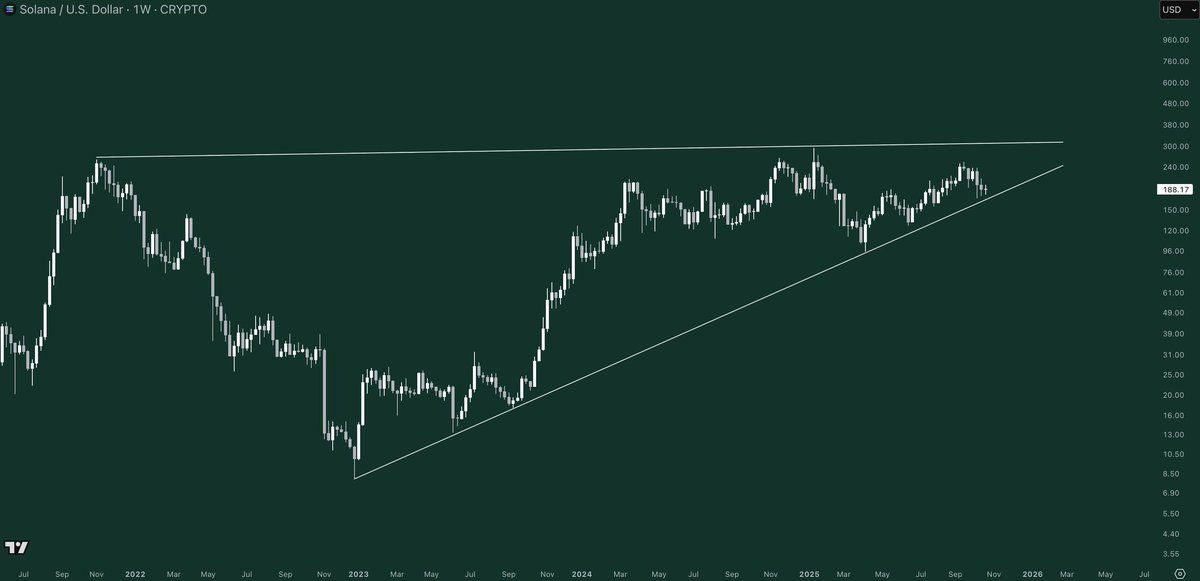 Technical data shows Solana consolidating inside an ascending channel that has guided price action since early September. The $186 level continues to provide major support, aligning with the 200-day EMA on the daily chart. If SOL maintains closes above this zone, traders expect an upside move toward $203 and $214 in the near term.