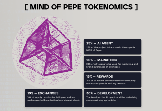 As for tokenomics, the team has taken a balanced approach: 25% for the AI agent, 30% for ongoing development, 20% for marketing, 15% for staking, and 10% for exchange listings.