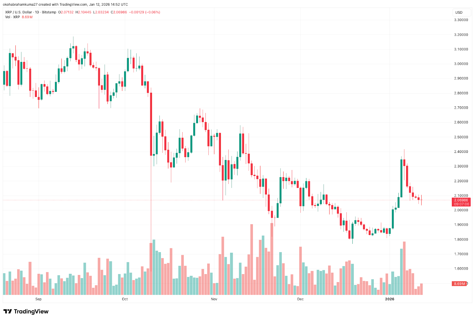 The XRP price outlook remains mixed as the asset struggles to break free from bearish sentiment. Despite a massive 214% increase in trading volume over the last 24 hours, the price has actually declined by 4% in the last week as of January 12th. This suggests that the XRP price prediction volume is driven more by distribution or short-term speculation.